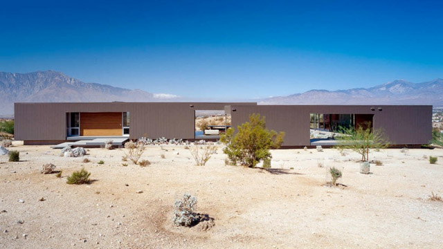 The prefab operation launched with this vacation home prototype — owned by Marmol and his wife — in Desert Springs, California. The sleek metal structure, hovering like an oasis in the desert landscape, quashes preconceived notions about what prefab architecture looks like.