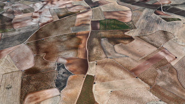 In June 2010, Canadian photographer Edward Burtynsky headed to the remote and dry Monegros region of northeastern Spain, where he hired a helicopter pilot and took to the sky to shoot pictures of the topography below. The results, featured in Sunday’s New York Times Magazine, are stunning images of farmland patterns that could easily pass as abstract art.