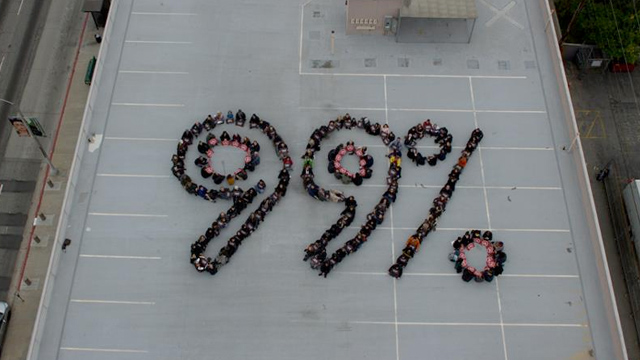 But maybe the coolest part was performed by the public, when people gathered in the parking lot to form a massive “99%,” which was photographed from above. A video of the act is being edited as we speak.