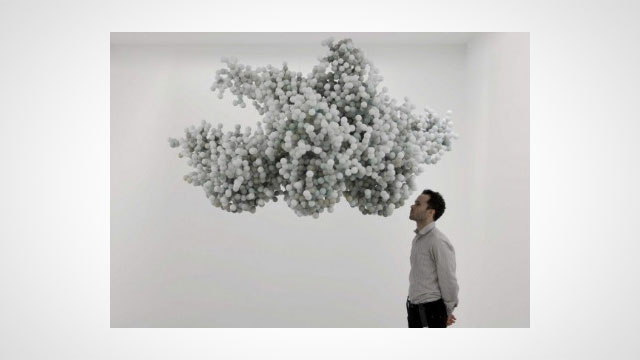 Featuring ink drawings and 3D sculpture, "Animal Architecture" is a study in juxtaposition. A modernist architectural ruin is pictured inside a cave. A kangaroo looks perplexedly at a slab of concrete floating in the landscape. A sculpture of a cloud is made of plastic balls.
