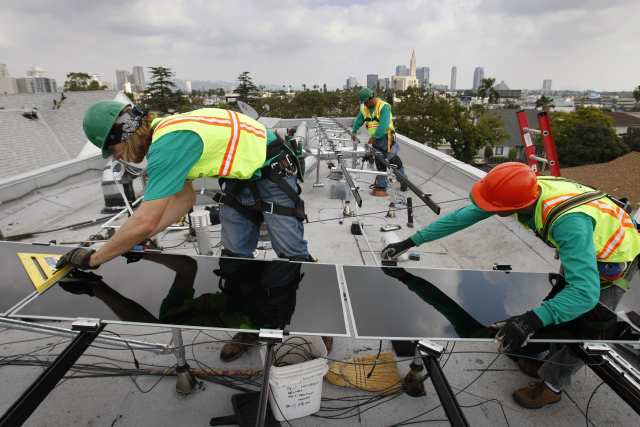 Photo: Workers install solar panels in West Los Angeles. (Allen J. Schaben / Los Angeles Times)