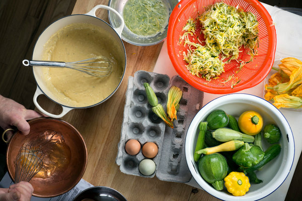 We’ve been picking zucchini, squash and squash blossoms for the past two weekends here in California (Santa Barbara to be exact), and there’s nothing that says summer mroe than stuffing a squash blossom or creating a dish out of the meat of the stuff. David Tanis lets us in on his zucchini and squash blossom sufflee recipe.