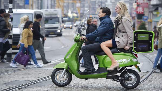 The scooters are high-tech, kitted out with navigation and tracking systems by the Dutch firm TomTom and a Samsung smartphone which is locked into the dash and a tablet on the back, which is used for digital advertising.