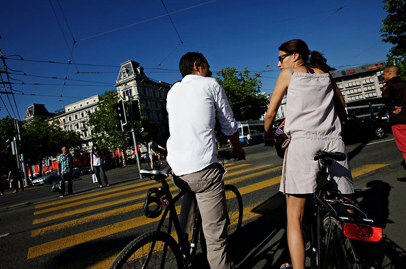 Photo: Pedestrians and cyclists wait for a green light in downtown Zurich. (Christoph Bangert / NYT)