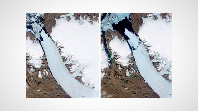 Photo: Satellite images taken on July 28, left, and Aug. 5, right, shows the Petermann Glacier in northern Greenland before and after a 110-square-mile piece of ice broke off. (NASA/AP)