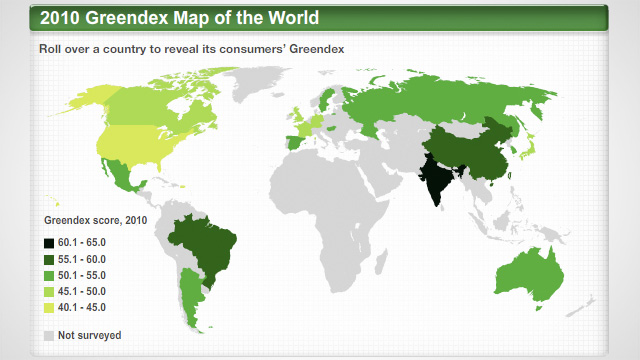 National Geographic and Globescan teamed up for the third annual Consumer Greendex study, which evaluates the "greenness" of shoppers in various countries around the world. The study monitored 17,000 consumers in 17 countries, taking into account energy use, transportation, food, housing, and knowledge of environmental issues. The end result is a vaguely scientific index of sustainable consumption.