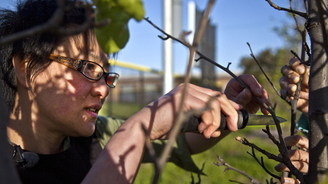 Photo: Guerrilla grafter Tara Hui splices a fruiting pear branch onto a decorative fruit tree somewhere in the Bay Area. (Lonny Shavelson / NPR)