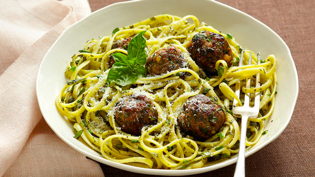 3. Cook the pasta in the boiling water until tender but not mushy. While the pasta is cooking, purée 11/2 cups of the herbs with 4 tablespoons oil, the garlic and some salt and pepper in a mini food processor or blender; leave the sauce rough or add a little water if you want it smoother. Drain the pasta, reserving about a cup of its cooking liquid. Toss the pasta with the herb sauce and most of the remaining herbs, adding the reserved liquid if the mixture seems dry. Top with the meatballs, garnish with Parmesan and the last of the herbs and serve.