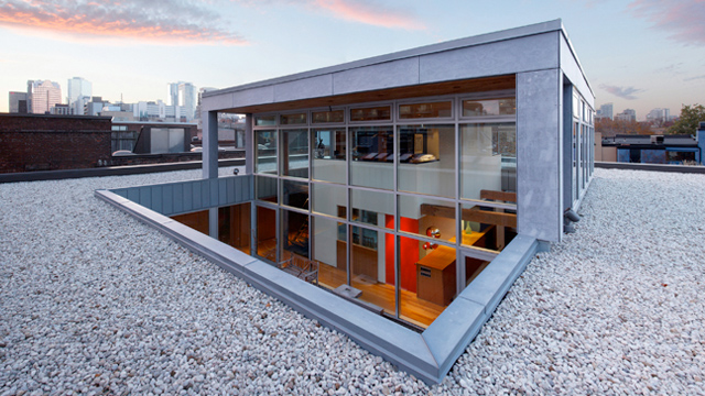 Part of the transformation of a former industrial building into residential condos, the rooftop residence employs several sustainable design strategies, from effective daylighting and a green roof to passive solar harvesting and natural ventilation. A sizable incision in the central part of the warehouse roof lets in daylight and offers access to the green roof.