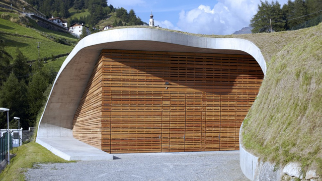 Conceived as a fracture in the landscape, monovolume‘s Punibach hydroelectric power station is harmonically integrated into its alpine surroundings. A concrete slab separates the smooth hilly landscape and the raw building structure made out of natural, earth coloured materials. At night, the thin wood planks that form a lamellar wall allow warm light from the interior to glow in the pitch-dark surroundings.