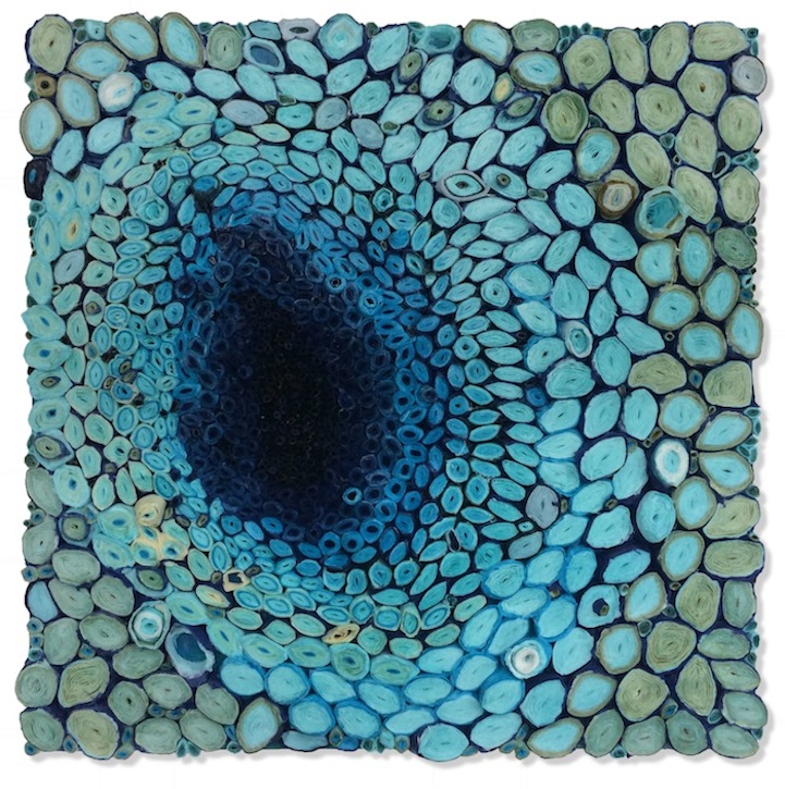 Each composition has an organic flow reminiscent of a coral reef or a barnacle. The artist says, “When I discovered the layered, circular form, I loved how I could use this one simple module to create worlds of compositions.” She uses that approach to create all of her variously sized rolls of paper and scatters them across the canvas. The different forms, colors, and textures create a dynamic composition that is filled with energy and life.