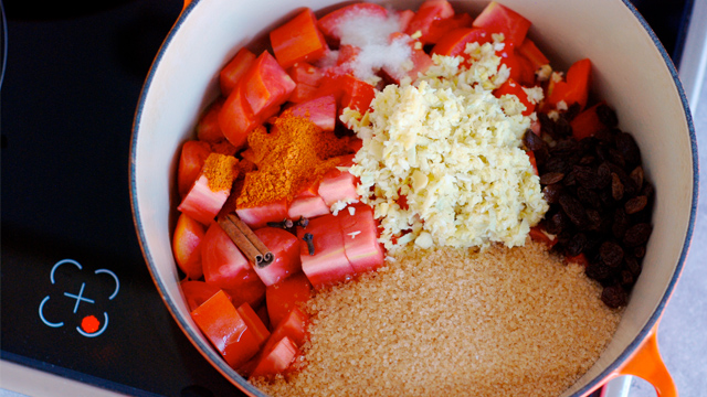 2. While the chutney is cooking, sterilize four or five glass jars and lids in boiling water or a hot oven. When the chutney has finished cooking, ladle it carefully into the clean jars and quickly screw on the lids. Turn the jars upside-down to cool. If you plan to eat the chutney within a few weeks of making it, there’s no need to can it; simply keep it in the fridge.