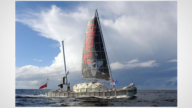 Powered by solar panels and windmills, the Plastiki is held together by an organic glue made of sugar cane and cashews. The mast, a recycled irrigation pipe, nearly snapped in a fierce storm off the Australian coast.