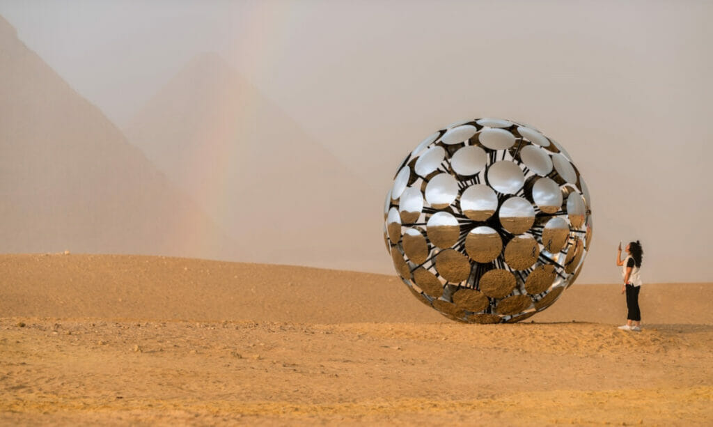 The Giza pyramids are the dramatic backdrop for a new installation by anonymous Spanish artist SpY. Inspired by Egyptian symbolism and mathematics, the piece is part of the exhibition Forever is Now II. Organized by Culturvator/Art D’Égypte, the exhibition asks artists around the world to take inspiration from Egypt’s rich cultural history. In SpY’s case, he looked at the logical and spiritual world of Ancient Egypt to put together his piece, ORB.