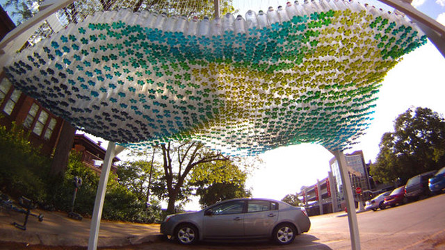 Nebraska designer Garth Britzman has made what may be one of the coolest recycling projects we’ve ever seen. Britzman collected 1,500 plastic pop bottles and partially filled them with colored liquid to create an amazing, wave-like parking canopy for his car.