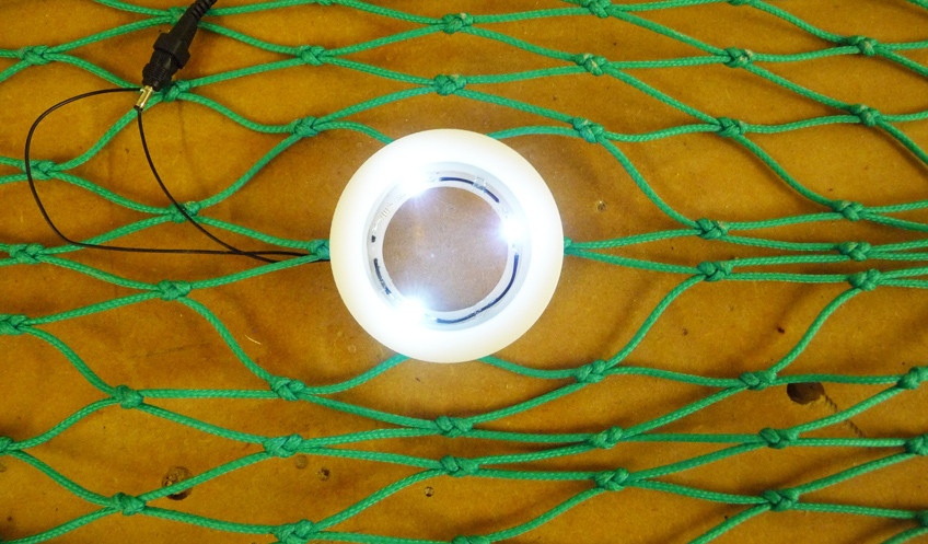 The SafetyNet concept, envisioned by Dan Watson, uses LED-illuminated rings that allow smaller fish to escape through the net. Larger mesh holes along the bottom enable threatened species such as cod to escape as well. And with a redesigned door to the net, the trawl does not drag along the seafloor and cause damage.