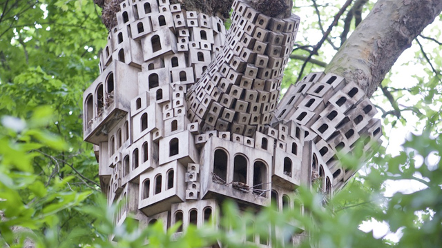 The Spontaneous Cities are temporary interventions in the trees reflecting the local architecture, a metaphorical interplay between the condition of the animal and the human. As well as being open to occupation by urban birds and insects, Spontaneous City can also be read as an allegory of population crash and dwindling biodiversity.