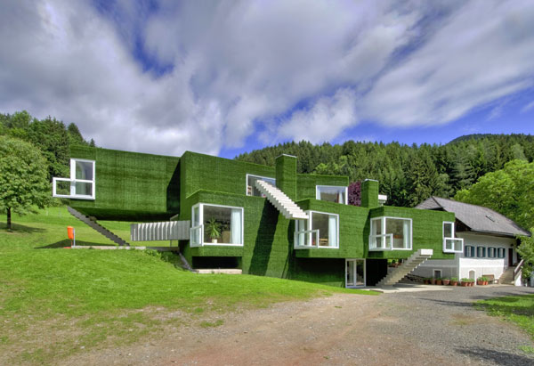 Surrealist sculpture and green architecture collide in this hillside Austrian home that might make M.C. Escher blush — and Mies van der Rohe cringe. The detached house, designed by Weichlbauer Ortis Architects, is covered in a soft synthetic turf, offering a strange yet somehow literal take on green wall design. With willfully superfluous windows extending from other windows and weirdly placed concrete staircases that lead to nowhere, the home turns architectural function on his head.