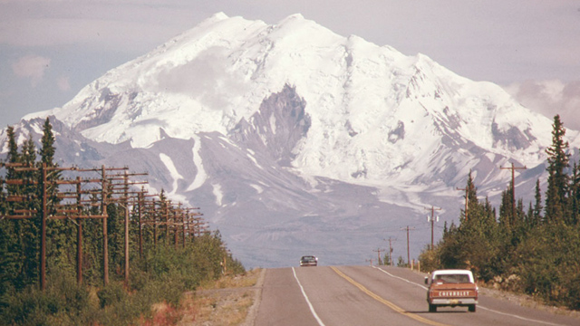 1. Looking east along Alaska’s Glen Highway toward Mount Drum, near the intersection of the Trans-Alaska Pipeline, then under construction in August 1974. (Dennis Cowals/National Archives and Records Administration)