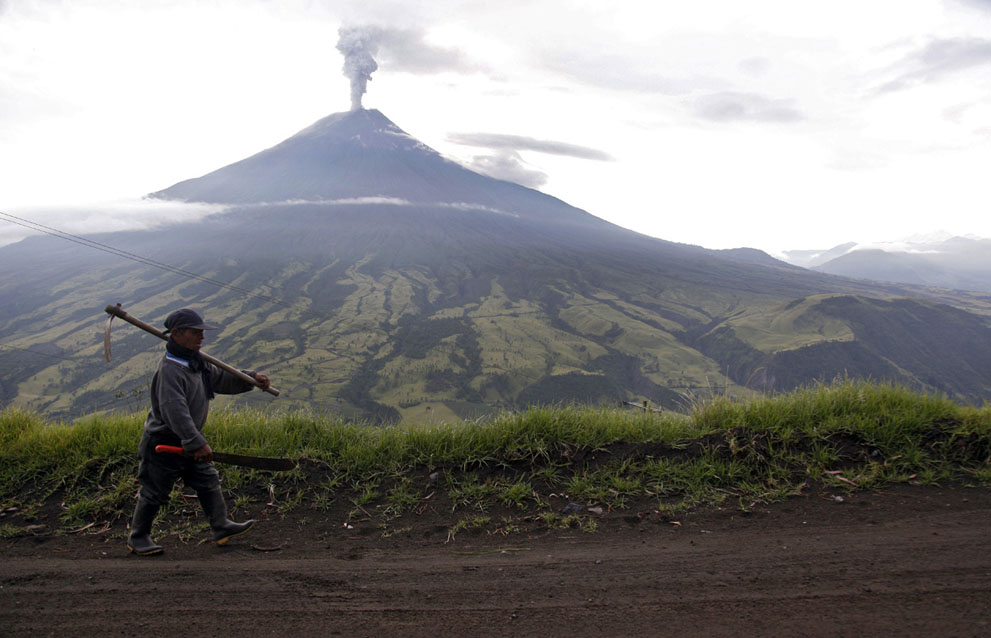 1. A man walks as the Tungurahua Volcano (background) spews ash, in Cotalo, Ecuador, on November 29, 2011. Ecuador’s Tungurahua volcano spewed red-hot rock and ash as officials upgraded their eruption warning level to orange and some at-risk communities began evacuations. (Pablo Cozzaglio/AFP/Getty Images)