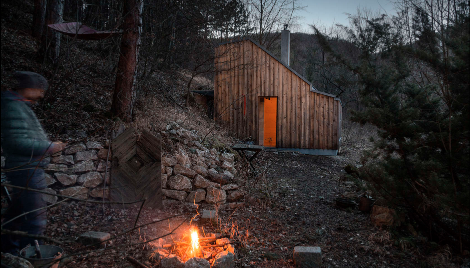 This simple house refers intensively to its environment, follows the contour of a previous, decaying building and was really drafted around a man and his passions. An angular shape encloses space on two levels in this retreat. Firmly closed on all sides with wooden bars, the hut can open his windows to different views. Totally made of wood and prefabricated it provides everything you need in a such a confined space. The hut as a striking identity becomes a partner, a place of retreat, but also a space for hospitality and personal development. Arrive, find shelter, rest, nourish yourself and find balance within. Then there’s the view outside into the wild.