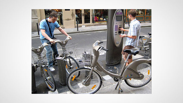 Bike sharing programs are widespread in Europe. In Paris, around 100,000 use the Velib’ system every day.