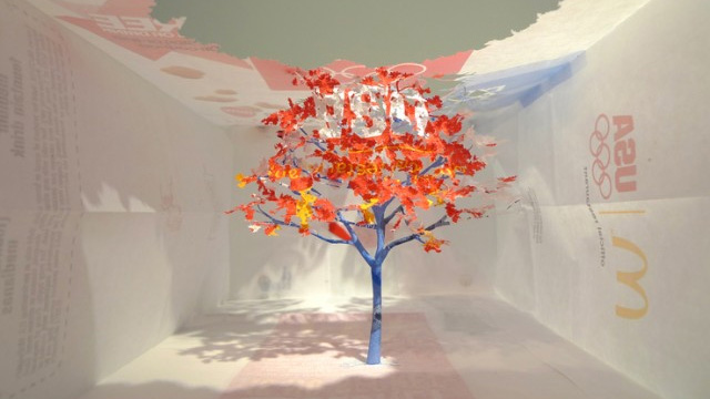 Made using only the new 2012 Olympics McDonald’s bag and some glue, the intricate tree features a blue trunk and red and orange leaves. It’s showing as part of a new group exhibition at David B. Smith Gallery in Denver.