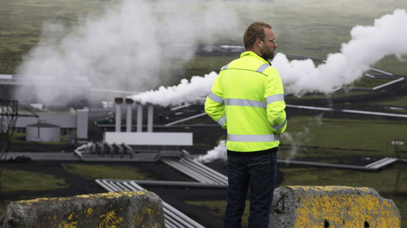 Photo: Bergur Sigfusson, CarbFix’s technical manager, surveys the Hellisheidi geotherman power plant in Iceland. (Brennan Linsley / AP Photo)