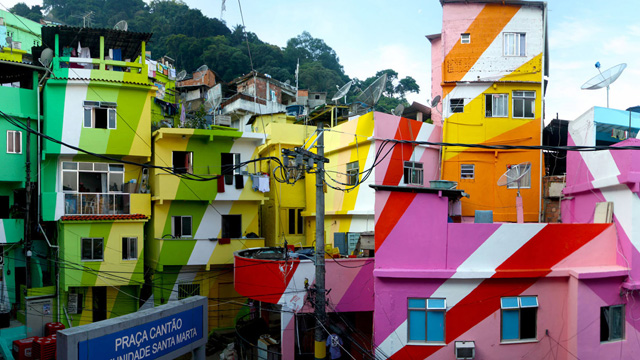 In Santa Marta, a hillside favela in the heart of Rio de Janeiro, two artists from Holland are using a massive art intervention to transform the community. Jeroen Koolhaas and Dre Urhahn originally came to Brazil in 2005 to shoot a documentary on the vibrant favela music scene. They never left. The two stayed in Rio to form Favela Painting, an organization dedicated to creating "striking artworks in unexpected places" that transform poor communities into radiant landmarks. For their latest endeavor, “O Morro†(The Hill), they enlisted the help of local youths to paint 34 houses with beams of bright color, radiating into the city.