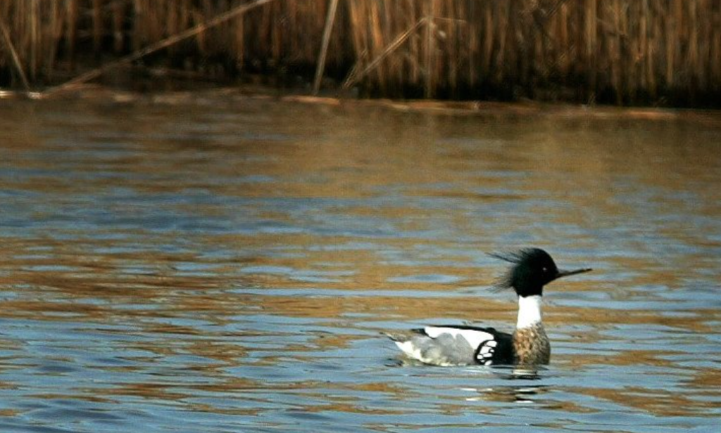 I had been watching the duck as it joined a group of three or four others when it began behaving as if it were gagging. As he plunged his neck and chest into the water, he cocked his gaping, narrow bill up to the sky. This may or may not have impressed a mate, but it certainly impressed me. I was watching an ancient dance; a rite of spring. Unlike the chubby bufflehead ducks nearby, the mergansers were low-slung and long, and far more colorful. Turning to the page in the field guide where mergansers were illustrated, there was no mistaking that this was a male red-breasted.