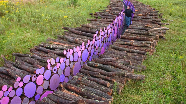 Bright, synthetic color meets natural materials in “Wake,” a land art installation by Michigan artist Michael McGillis. The semi-subterranean piece transforms the relatively mundane sight of giant wood piles into a surprisingly beautiful and interactive work of art. Originally installed at Minnesota’s Franconia Sculpture Park in 2006, the installation consists of a 95-foot long trench lined with crosscut logs. The ends of the logs are painted various shades of purple, inviting viewers to walk through. Really cool.