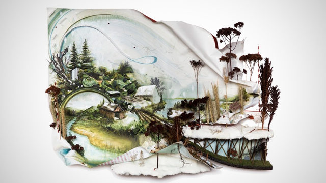 Paper, found objects, and elements of nature integrated in complex landscape works