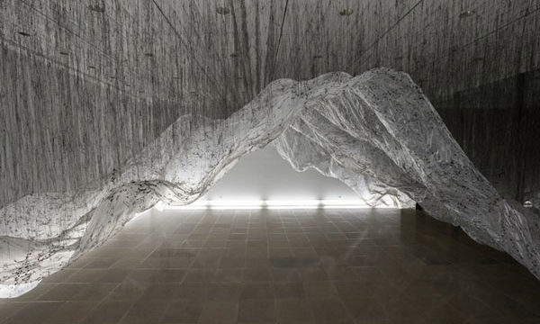 An illusory mountainscape installation 'invisibly cast' in draped plastic