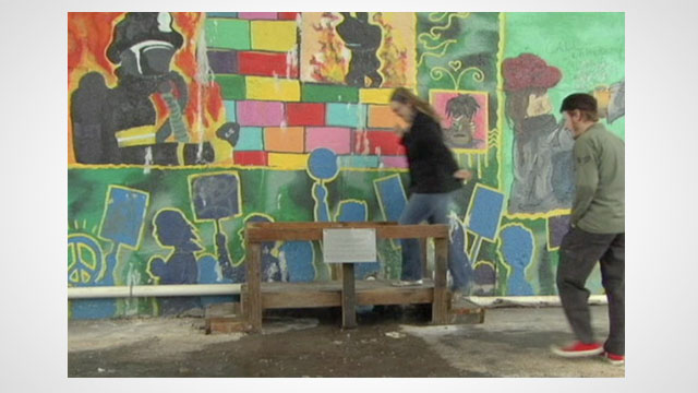 Unauthorized, recycled wood foot bridge spans stretch of flooded NYC sidewalk.